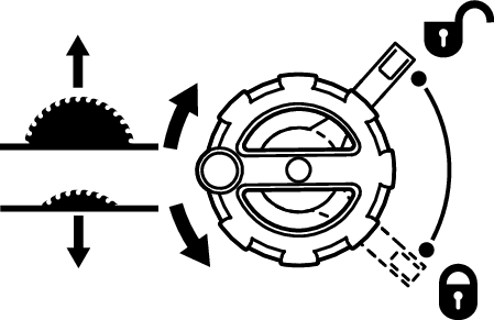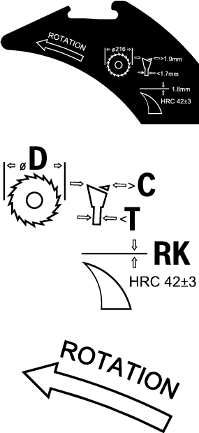 Take note of the information on the riving knife when changing the saw blade. Otherwise, there is a risk that the riving knife will hook into the workpiece. D Diameter of the saw blade C Minimum cutting width (tooth thickness/offset) T Maximum base blade thickness RK Riving knife thickness ROTATION The cutting direction of the teeth (direction of the arrow on the saw blade) must match the direction of the arrow on the riving knife See also the "Technical Data" section. |